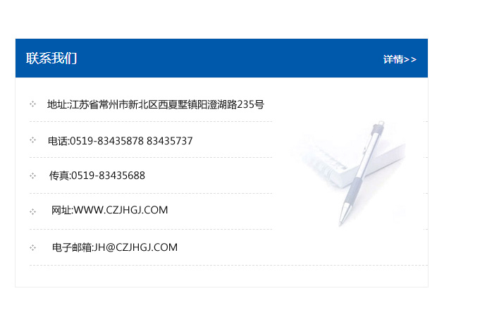 地址:常州市新北區友邦商務大廈1幢16、17層  電話:0519-85101652  傳真:0519-85112595  郵編:213022  網址:www_cz-jiayue_cn.51gaia.com  郵箱:xiajifengaa@163.com